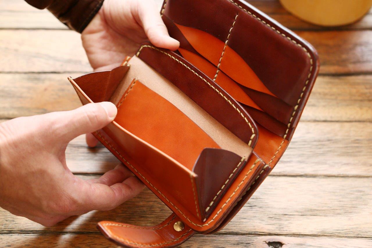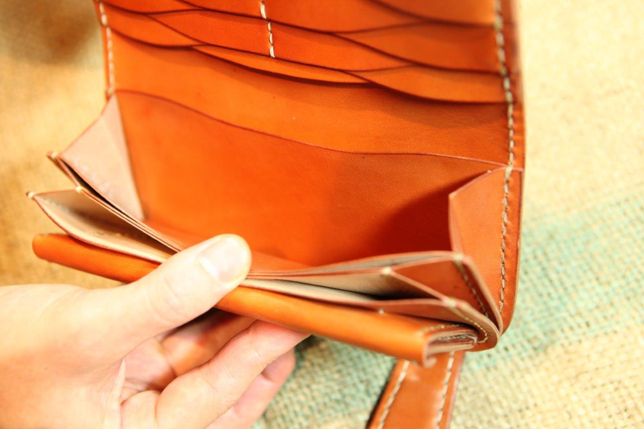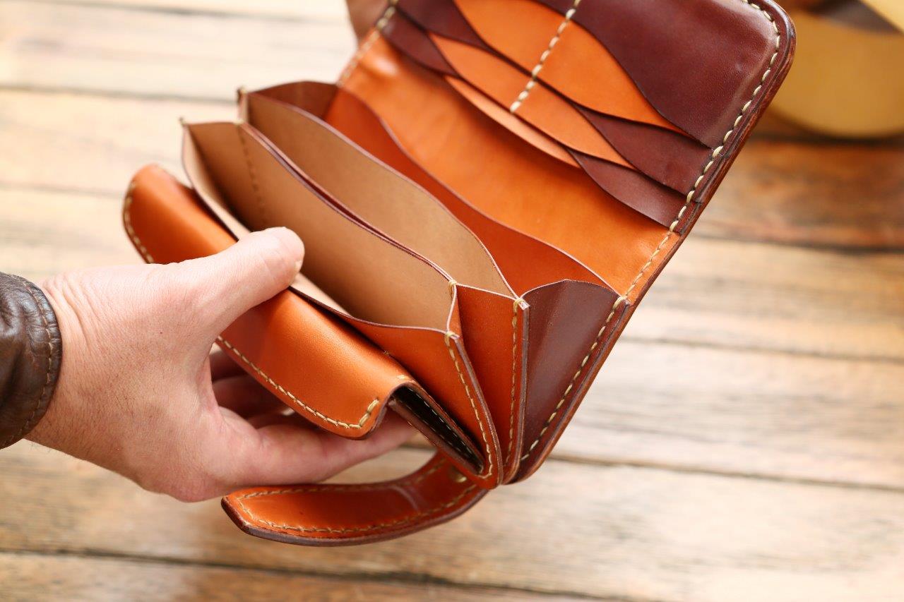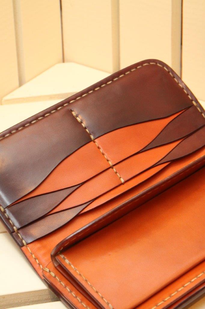 植物タンニンで鞣した、迫力あるクイルマークが特徴のウォレットです。また僅かながらクイルの無いノンクイルモデルもご用意。相性の良いブラウンレザーと合わせる事で、朱色の特徴をより際立たせました!