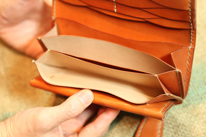 鮮やかな赤とナチュラルレザーのカードケースは、外観のコントラストをより印象深いものにします。